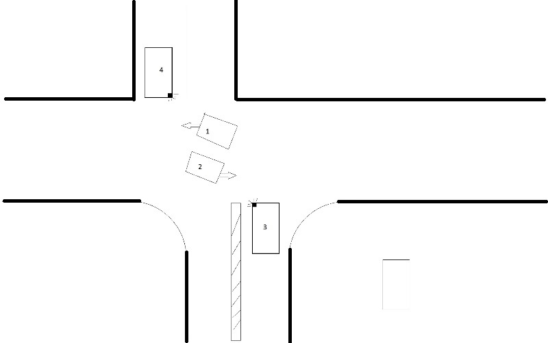 1 wjechała z miejsca, gdzie na rysunku stoi 3, a 2 nadjechała z miejsca, gdzie na rysunku stoi 4. 1 i 2 wjechały na zielonym świetle, 3 i 4 czekają na zielonym świetle. Na drodze poprzecznej na rysunku, świeci się czerwone światło.