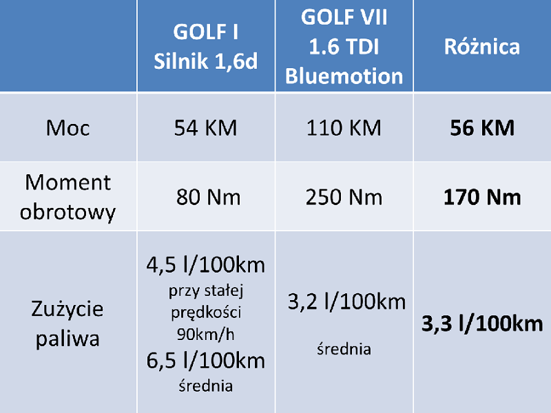 możesz porównać sobie wymiary, wagę, moc, moment obrotowy, emisję spalin Golfa I i VII.