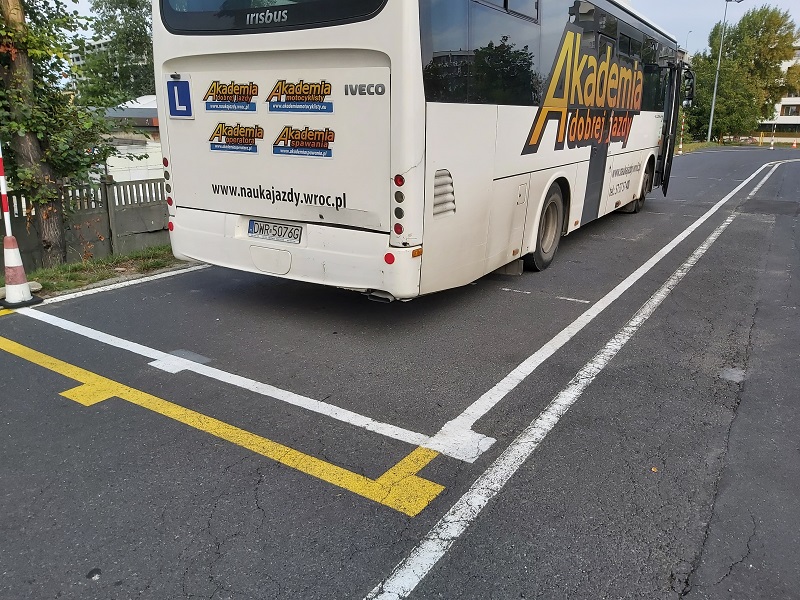 ponieważ to stanowisko jest również dla kategorii C+E ma długość 16m, a autobus musi być dłuższy niż 10m (we Wrocławiu 10,5m), a większość dwuosiowych nie przekracza 12m, więc zdający ma 5,5 - 4 metry luzu.